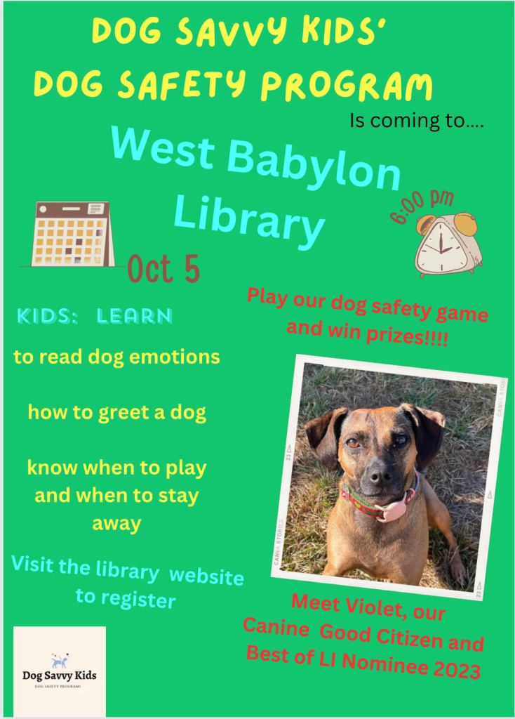 The West Babylon Public Library on Long Island is hosting a dog safety workshop for kids on October 5, 2023 at 6 pm.